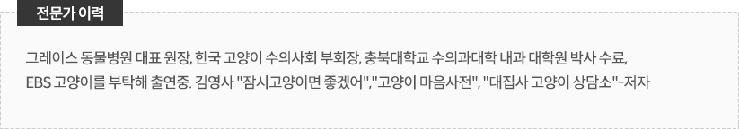 그레이스 동물병원 대표 원장, 한국 고양이 수의사회 부회장, 충북대학교 수의과대학 내과 대학원 박사 수료,