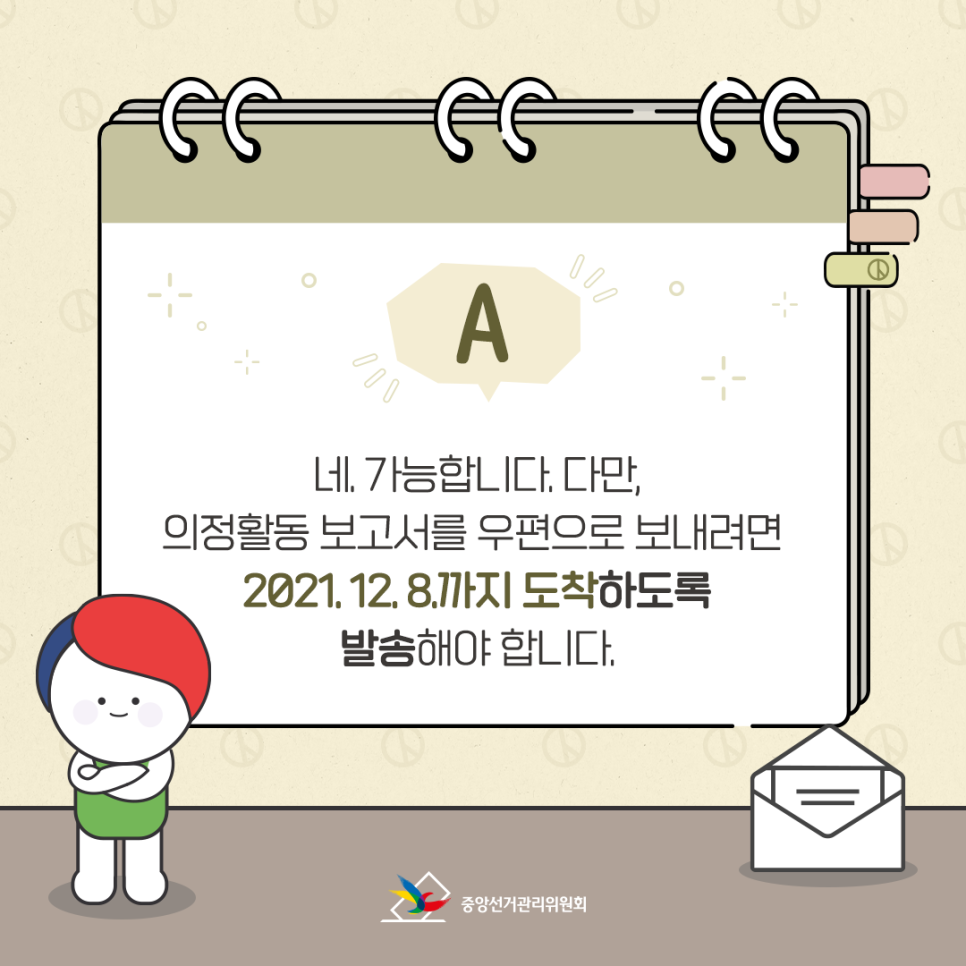 A. 네. 가능합니다. 다만, 의정활동 보고서를 우편으로 보내려면 2021.12.8.까지 도착하도록 발송해야 합니다.