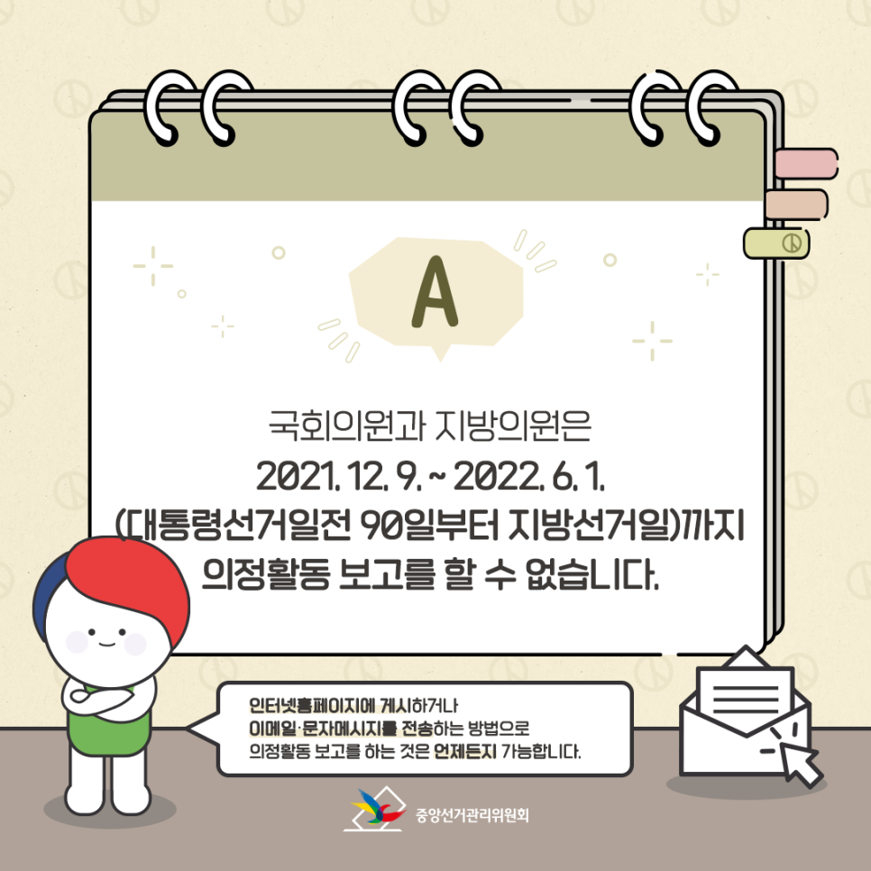 2021.12.9. ~ 2022.6.1.(대통령선거일전 90일부터 지방선거일)까지 의정활동 보고를 할 수 없습니다.