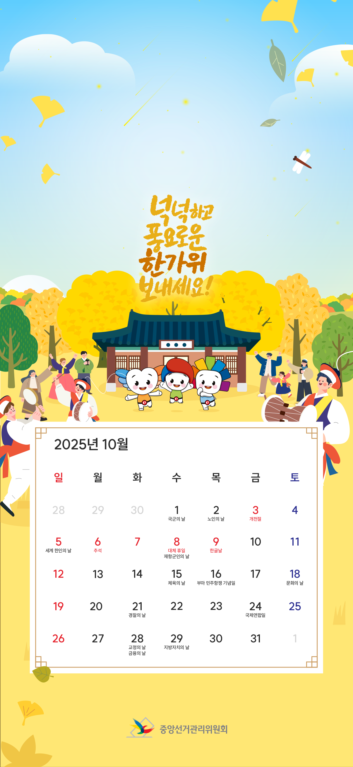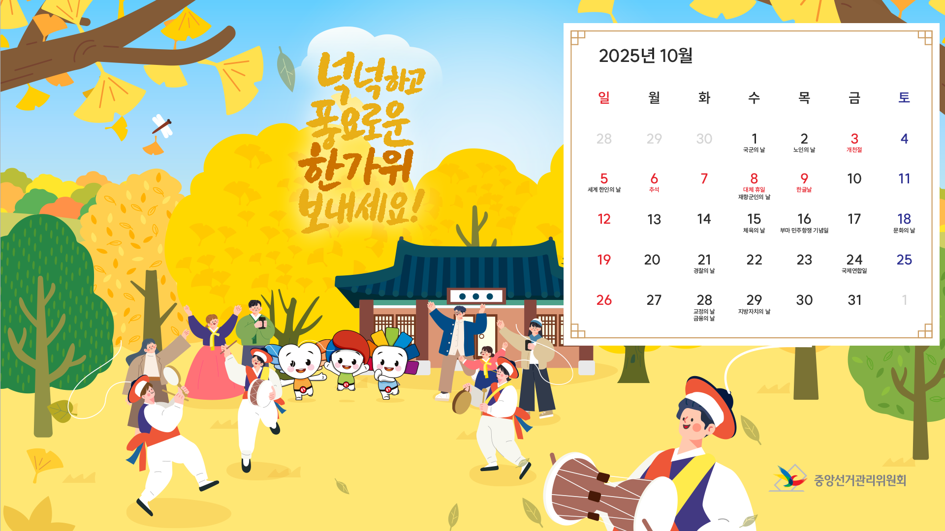 공공누리 마크 홍보과(02-3294-1034)에서 제작한 선거관리위원회 배경화면 달력(25년 10월) 저작물은 "공공누리" 출처표시-상업적 이용금지-변경금지 조건에 따라 이용할 수 있습니다. 자세한 내용은 [저작권정책]을 확인하십시오.