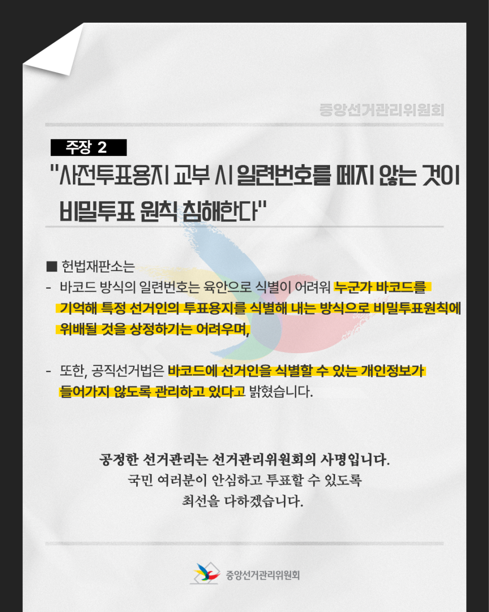 "사전투표용지 교부 시 일련번호를 떼지 않는 것이
