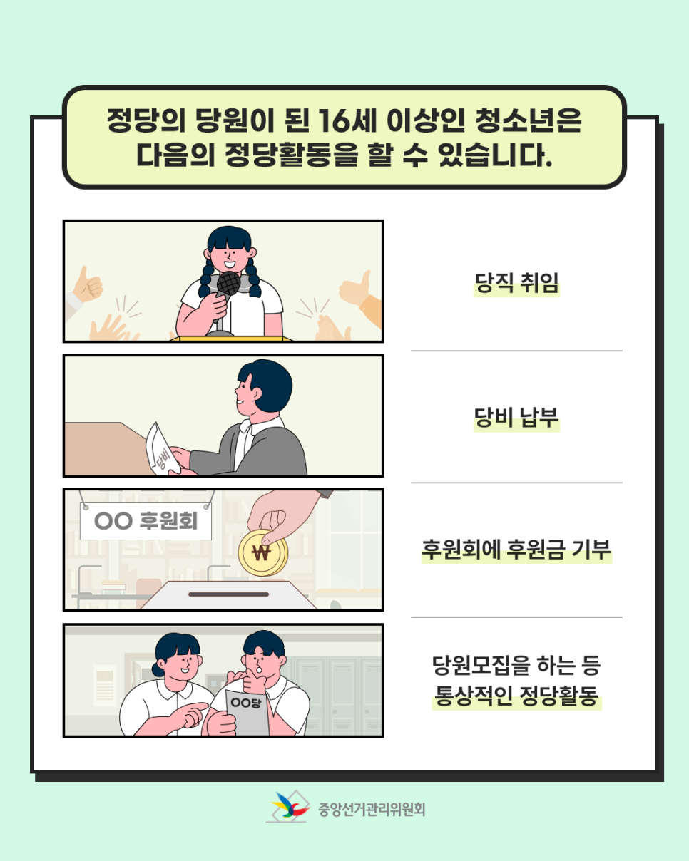 정당의 당원이 된 16세 이상인 청소년은 다음의 정당활동을 할 수 있습니다.