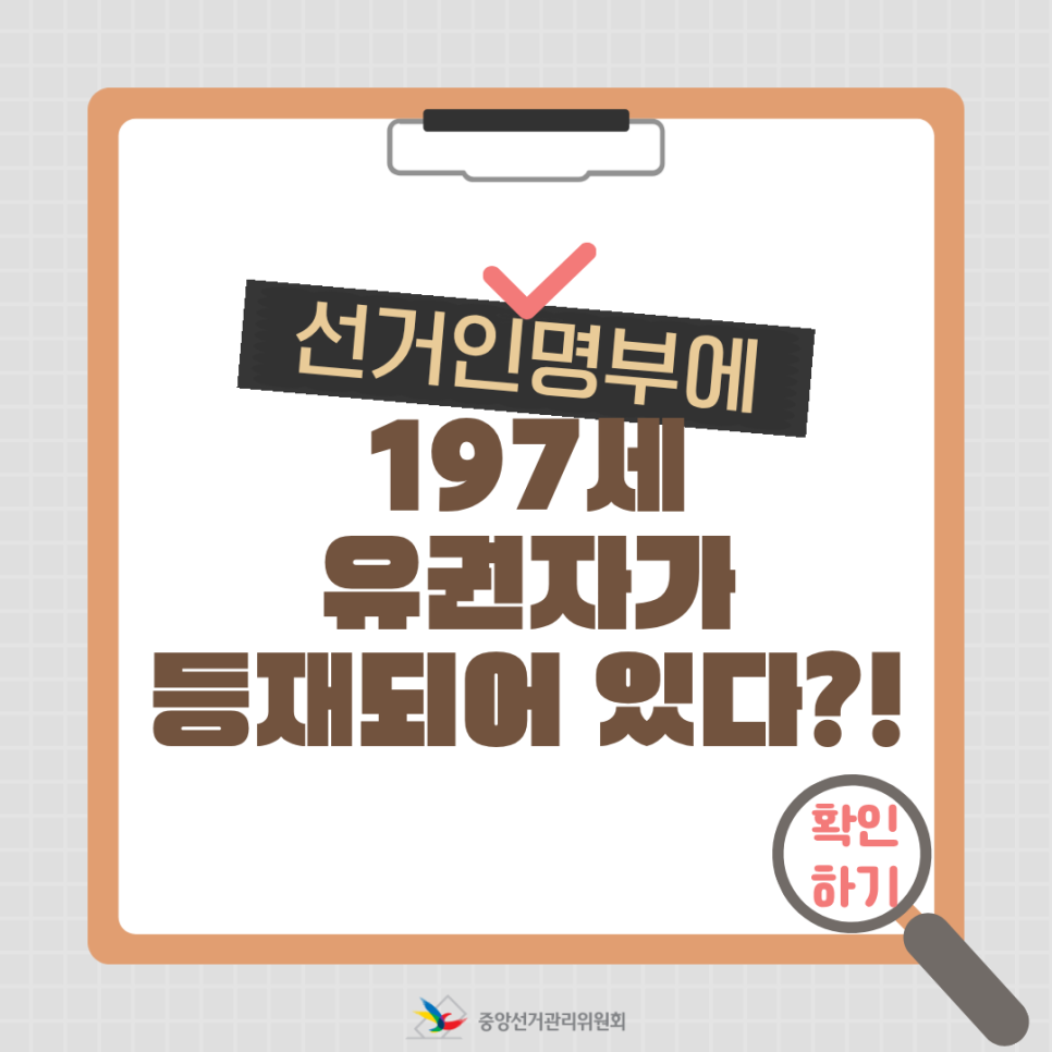 공공누리 마크 홍보과(02-3294-1034)에서 제작한 선거인명부에 197세 유권자가 등재되어 있다?! 저작물은 "공공누리" 출처표시-상업적 이용금지-변경금지 조건에 따라 이용할 수 있습니다. 자세한 내용은 [저작권정책]을 확인하십시오.