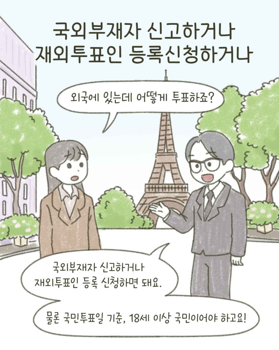 국외부재자 신고하거나 재외투표인 등록 신청하면 돼요.